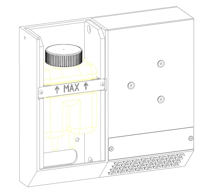 Основные внешние элементы: 1 - Основные дверцы; 2 - разъемы перефирии; 3 - регулируемые ножки; 4 - Резервуар СЖО; 5 - Угольный фильтр; 6 - Дверца доступа к катушкам; 7 - Разъем и кнопка питания; 8 - Элементы вентиляции.